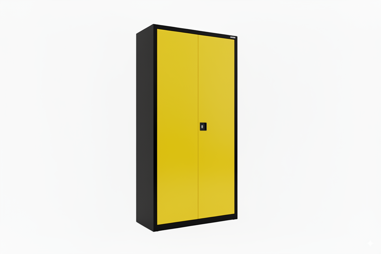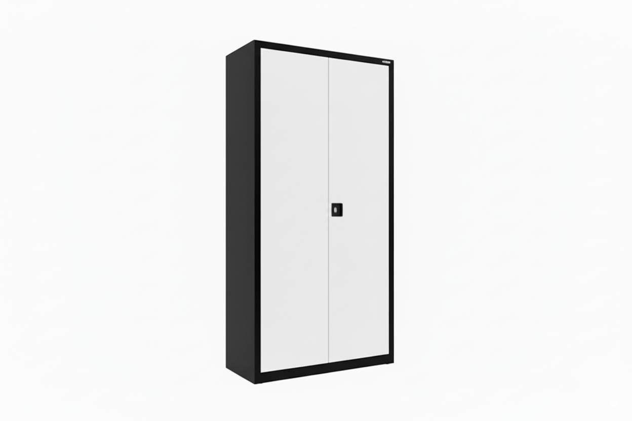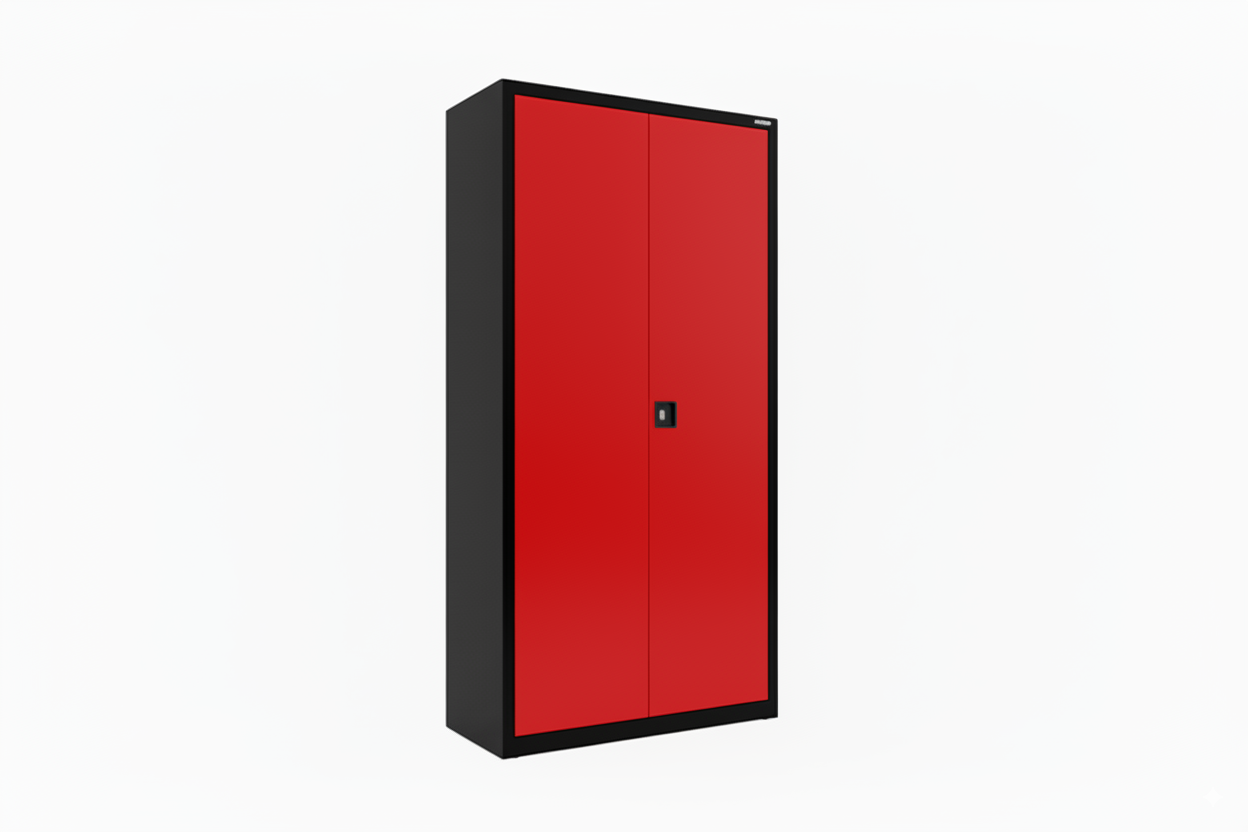 Szafa wykonana z blachy stalowej gr. 0,7 mm. Drzwi skrzydłowe ze schowanymi zawiasami. Uchwyt drzwiowy z zamkiem zabezpieczającym w 2 pkt. Półki przestawne co 25 mm dostosowane do teczek
