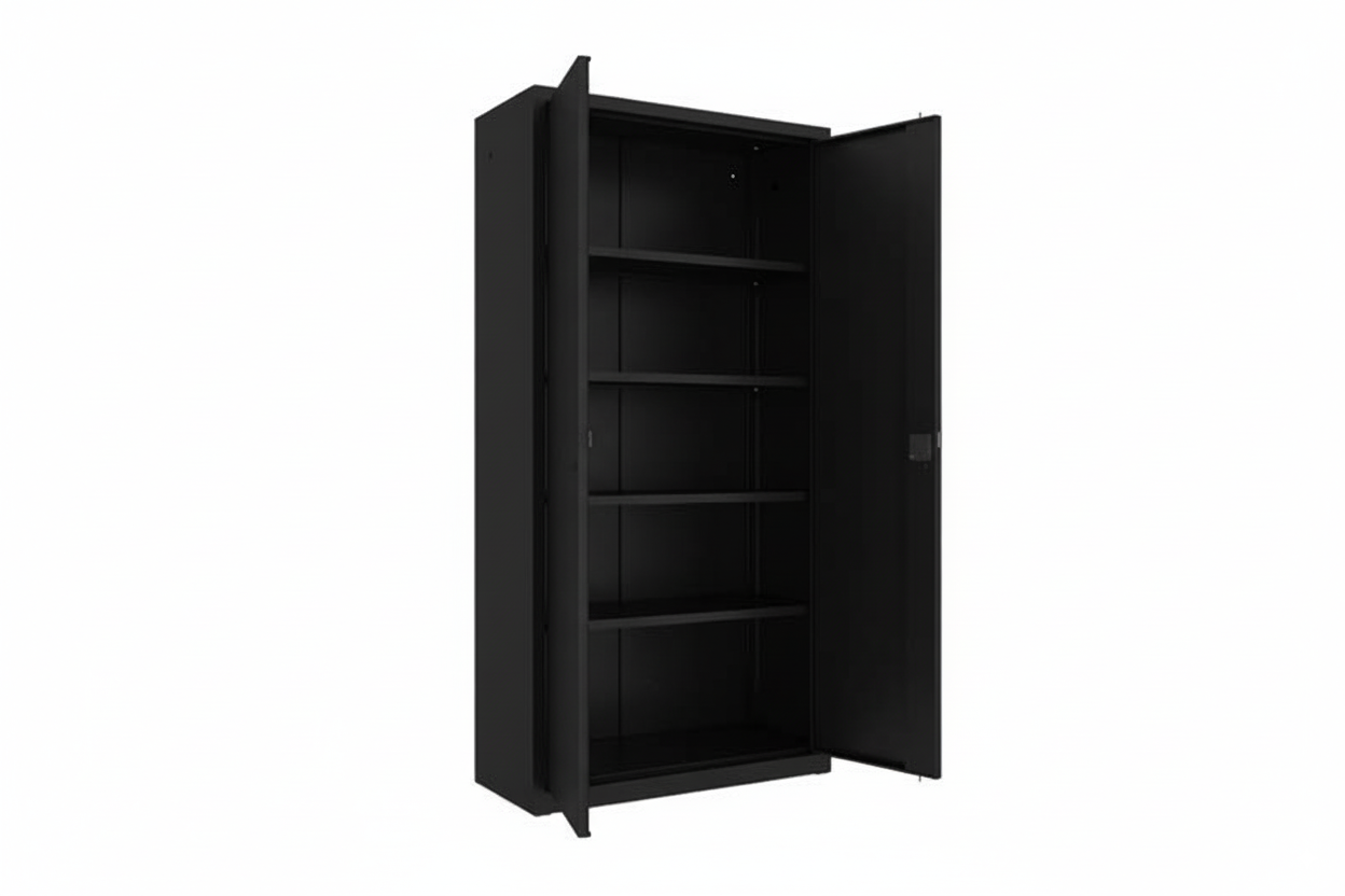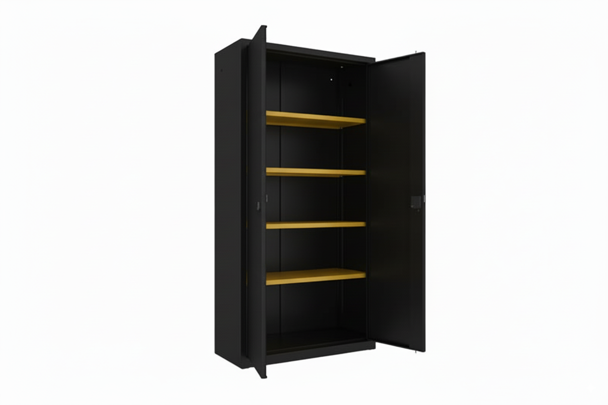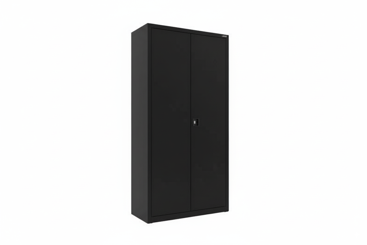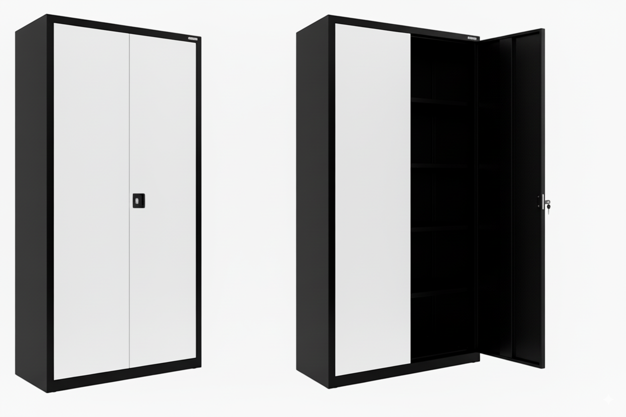 Szafa wykonana z blachy stalowej gr. 0,7 mm. Drzwi skrzydłowe ze schowanymi zawiasami. Uchwyt drzwiowy z zamkiem zabezpieczającym w 2 pkt. Półki przestawne co 25 mm dostosowane do teczek