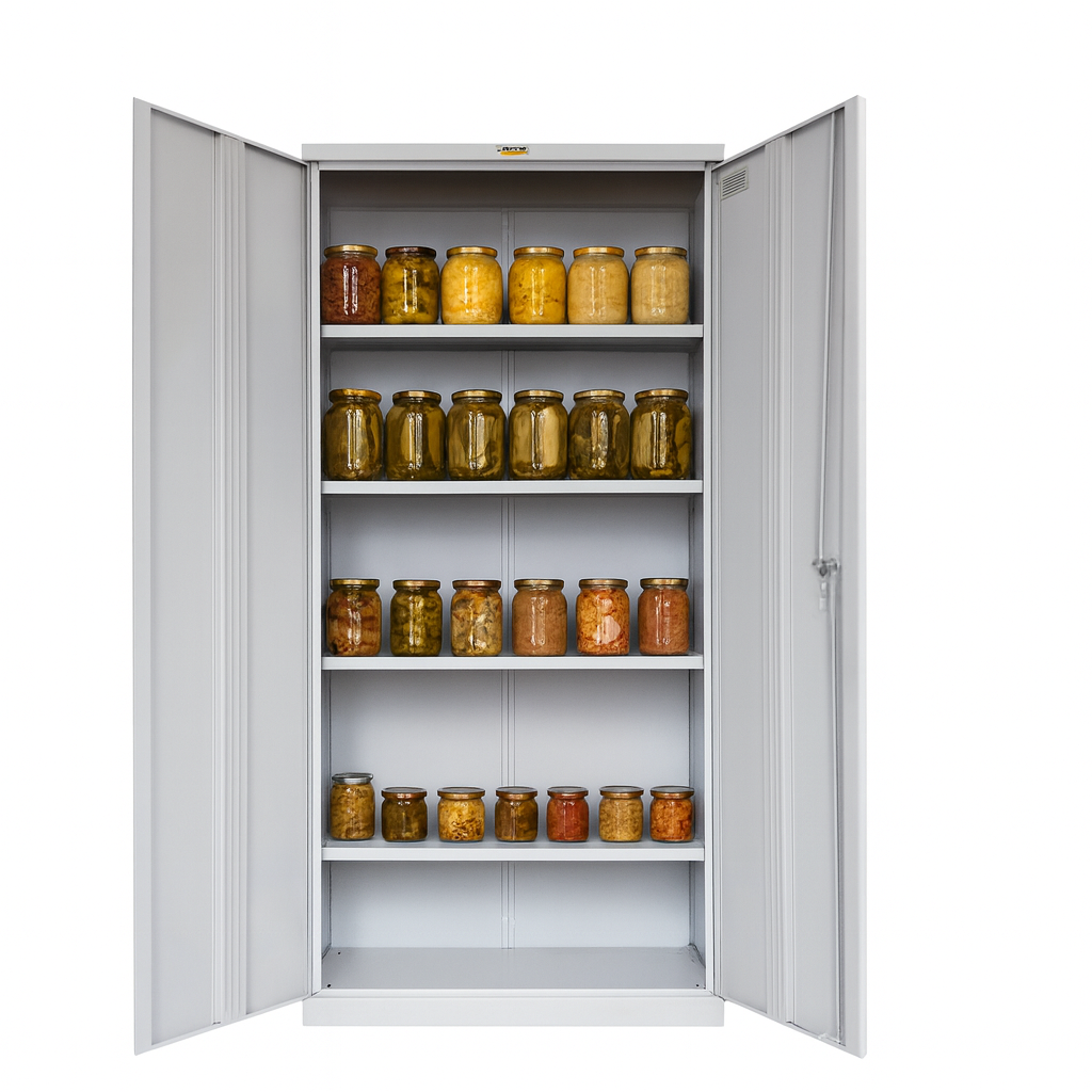 Szafa zamykana jest na klucz, co pozwala trzymać zapasy bezpiecznie – nikt nie podkradnie konfitur ani ogórków. Dodatkowe magnesy sprawiają, że drzwi nie otwierają się same, więc do środka nie dostaje się kurz. To bardzo praktyczne rozwiązanie, szczególnie jeśli szafa stoi w piwnicy albo garażu. Właśnie dlatego wiele osób traktuje ją jako metalową szafę do piwnicy, w której można poukładać wszystkie domowe zapasy.
