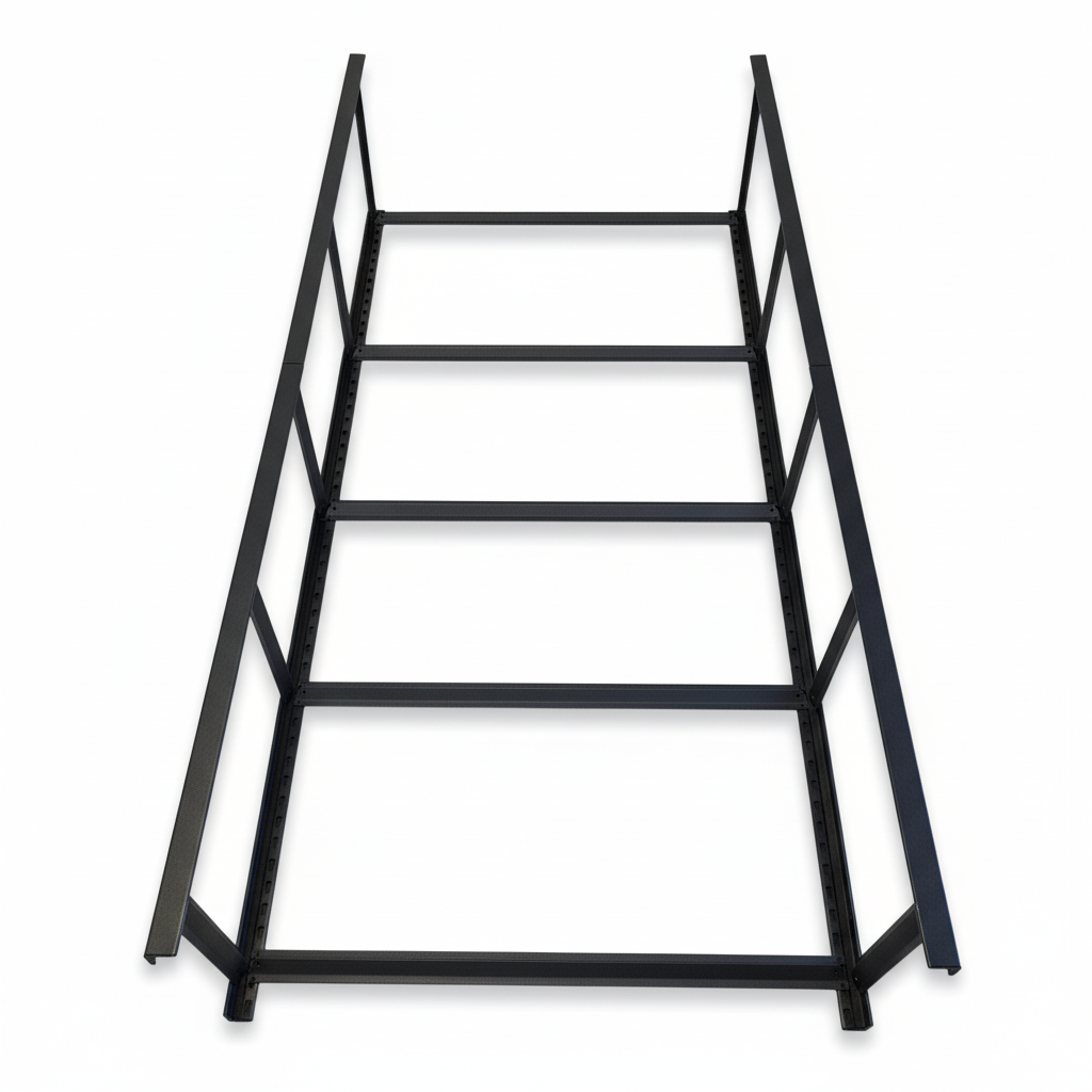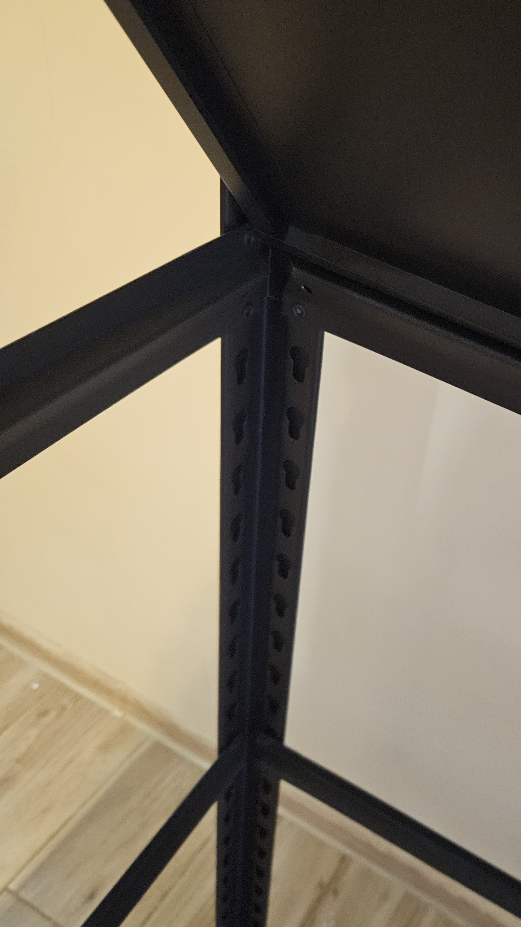 Panel półki wykonany jest z metalu, osadzany na belkach i gięty dwukrotnie na każdym rogu, co zwiększa jego sztywność. Dodatkowe wsporniki poprzeczne zgrzewane od spodu podnoszą wytrzymałość całej konstrukcji. Rozmieszczenie półek można regulować w dowolnym momencie — co 25 mm. Pojedyncza półka wytrzymuje obciążenie do 150 kg.