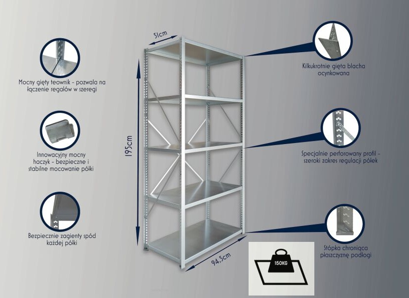 Regał Półkowy Ocynkowany 195x95x51 cm 5 półek - segment startowy