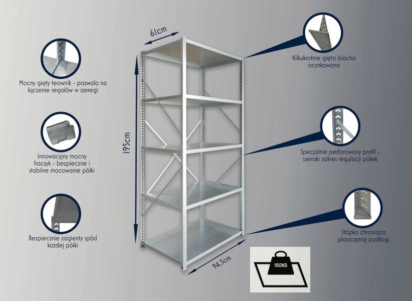 Regał Półkowy Ocynkowany 195x95x61 cm 5 półek - segment startowy