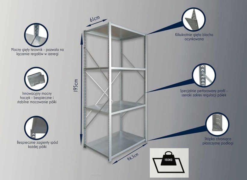 Regał Półkowy Ocynkowany 195x95x61 cm 4 półki - segment startowy
