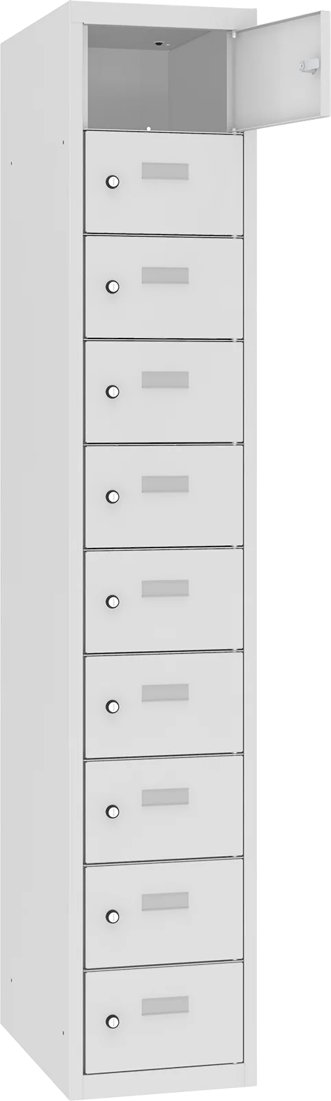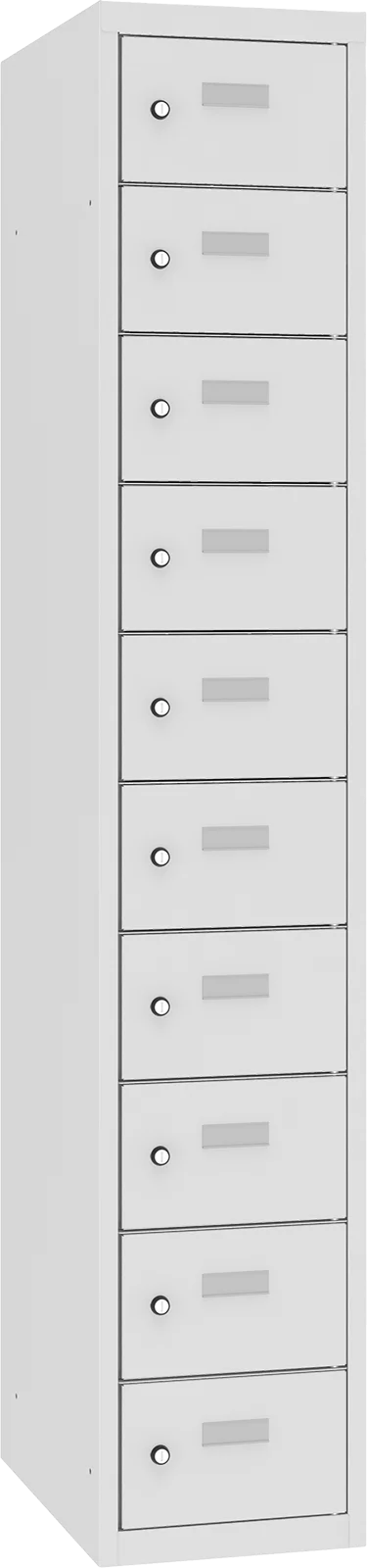 Model posiada 10 osobnych skrytek w jednej kolumnie, co pozwala na wygodne użytkowanie przez większą liczbę osób. Każda komora zamykana jest na zamek, dzięki czemu zawartość jest zabezpieczona i uporządkowana.