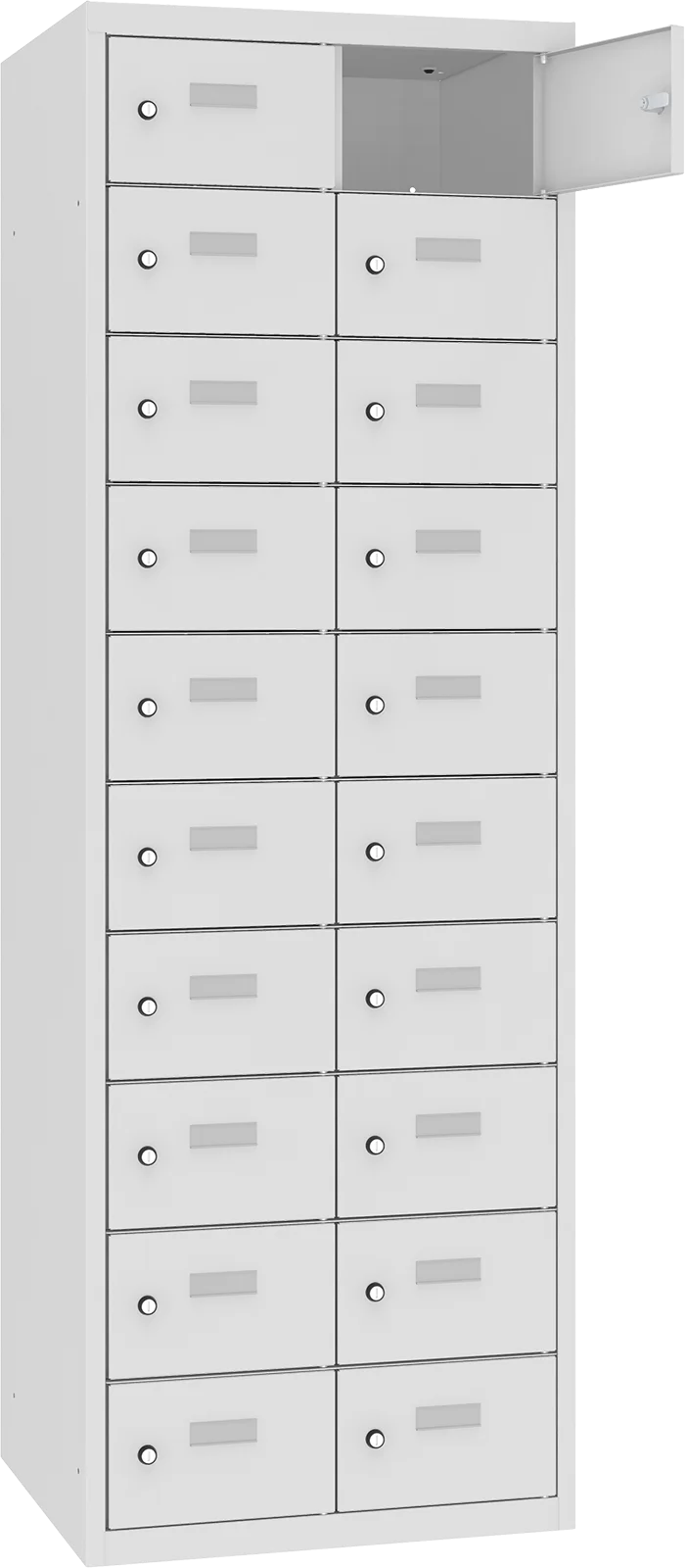 Szafka została wyposażona w 20 niezależnych skrytek zamykanych na klucz. Układ szafki obejmuje 2 kolumny po 10 skrytek, co pozwala wygodnie uporządkować zawartość i ułatwia dostęp użytkownikom w firmie, szkole lub na zapleczu socjalnym.