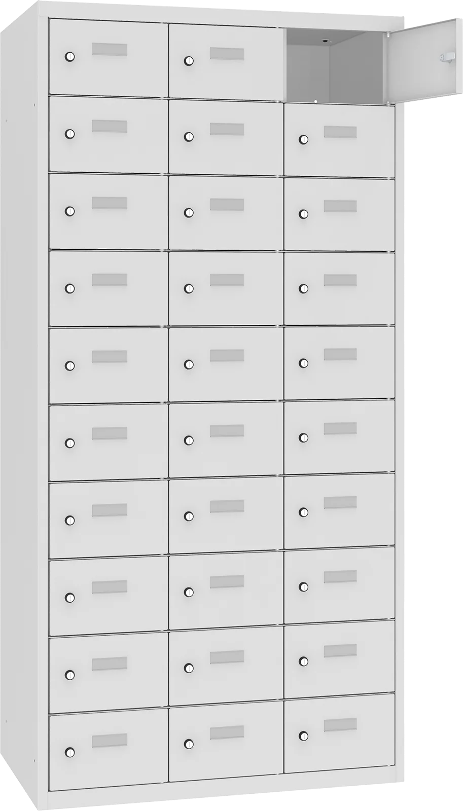 Szafka została zaprojektowana w układzie 3 kolumn, po 10 skrytek w każdej, co ułatwia organizację i zapewnia wygodny dostęp do każdej komory.