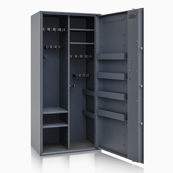 Model posiada dwa rzędy uchwytów na broń, a zastosowanie innowacyjnych, przestawnych uchwytów na metalowych szynach mocowanych na magnes pozwala na ich montaż na dowolnej wysokości – na tylnej ścianie lub na ścianach bocznych. Uchwyty na przestawnych szynach oferują dwa rozstawy pianek: 55 mm oraz 65 mm, a także możliwość regulacji na wysokość i głębokość sejfu, co pozwala dopasować wnętrze do indywidualnego układu broni. Dla większej wygody i bezpieczeństwa zastosowano podział szyny na broń, dzięki czemu nawet krótsza broń może zostać odpowiednio ustawiona i zabezpieczona. Uchwyty na magnesach mogą również służyć do przechowywania broni krótkiej. Szafy na broń zostały dodatkowo wyposażone w przestawne zawieszane pojemniki, ułatwiające organizację wnętrza. Całość uzupełnia piankowy dywanik na dnie sejfu, który chroni broń i wyposażenie przed zarysowaniami.