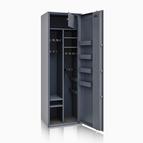 Sejf wyposażono w dwa rzędy uchwytów na broń, co pozwala na optymalne wykorzystanie przestrzeni. Łącznie dostępnych jest 16 uchwytów na broń. Innowacyjny system uchwytów na metalowej szynie mocowanej na magnes pozwala na ich montaż na dowolnej wysokości, zarówno na tylnej ścianie, jak i na ścianach bocznych. Uchwytom towarzyszą dwie wersje rozstawu pianek – 55 mm i 65 mm – oraz możliwość regulacji na wysokość i głębokość sejfu. Dodatkowy podział szyny poprawia komfort użytkowania i umożliwia stabilne ustawienie także krótszych jednostek broni. Magnetyczne mocowanie uchwytów może być również wykorzystywane do wygodnego przechowywania broni krótkiej.