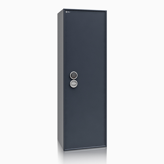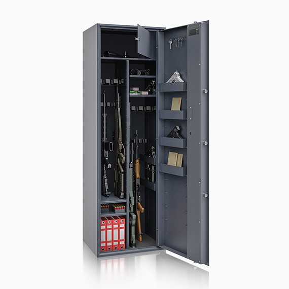 Sejf wyposażono w dwa rzędy uchwytów na broń, co pozwala na optymalne wykorzystanie przestrzeni. Łącznie dostępnych jest 16 uchwytów na broń. Innowacyjny system uchwytów na metalowej szynie mocowanej na magnes pozwala na ich montaż na dowolnej wysokości, zarówno na tylnej ścianie, jak i na ścianach bocznych. Uchwytom towarzyszą dwie wersje rozstawu pianek – 55 mm i 65 mm – oraz możliwość regulacji na wysokość i głębokość sejfu. Dodatkowy podział szyny poprawia komfort użytkowania i umożliwia stabilne ustawienie także krótszych jednostek broni. Magnetyczne mocowanie uchwytów może być również wykorzystywane do wygodnego przechowywania broni krótkiej.