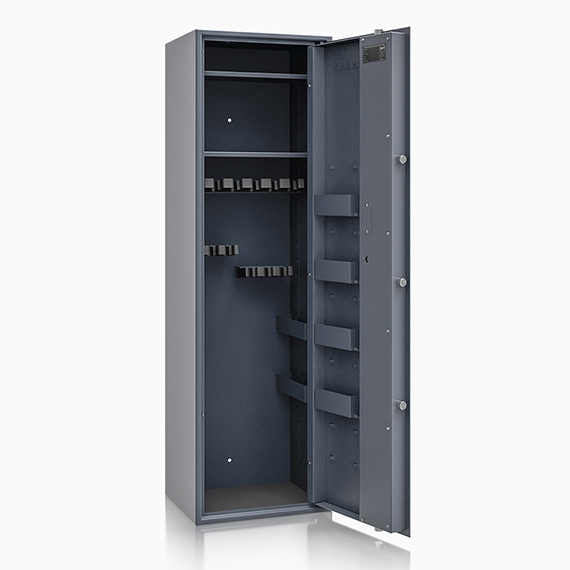 Sejf wyposażono w dwa rzędy uchwytów na broń, a dodatkowym atutem są innowacyjne uchwyty na metalowej szynie, które są mocowane na magnes. Pozwala to umieścić uchwyty: