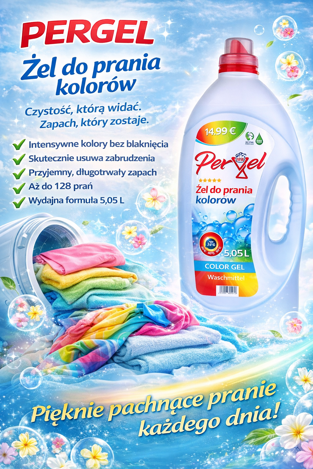 PERGEL to silnie skoncentrowany żel do prania tkanin kolorowych, który skutecznie usuwa zabrudzenia, jednocześnie chroniąc kolory przed blaknięciem i utratą intensywności. Nowoczesna formuła detergentu wspomaga proces prania nawet w niższych temperaturach, pomagając zachować dobrą kondycję tkanin na dłużej.