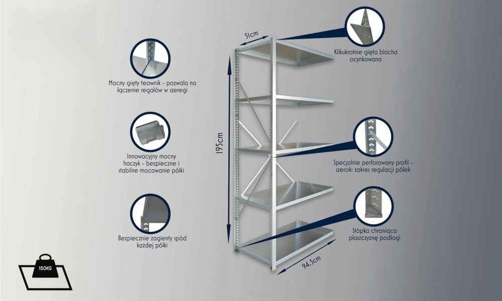 Wybierz dodatkowy regał półkowy ocynkowany 195x90x51 5 półek, aby maksymalnie wykorzystać swoją przestrzeń magazynową. Dzięki trwałej, odpornej na korozję konstrukcji, nasze regały doskonale sprawdzą się w intensywnie użytkowanych pomieszczeniach, takich jak magazyny czy warsztaty. Ustawiaj półki według swoich potrzeb i ciesz się idealną organizacją! Regał półkowy ocynkowany 195x90x51 5 półek w wersji dodatkowej to funkcjonalne rozwiązanie stworzone z myślą o rozbudowie istniejącego systemu regałów. Doskonale sprawdza się jako sposób na zwiększenie powierzchni magazynowej, umożliwiając efektywne zagospodarowanie przestrzeni bez potrzeby instalowania nowych, niezależnych regałów.