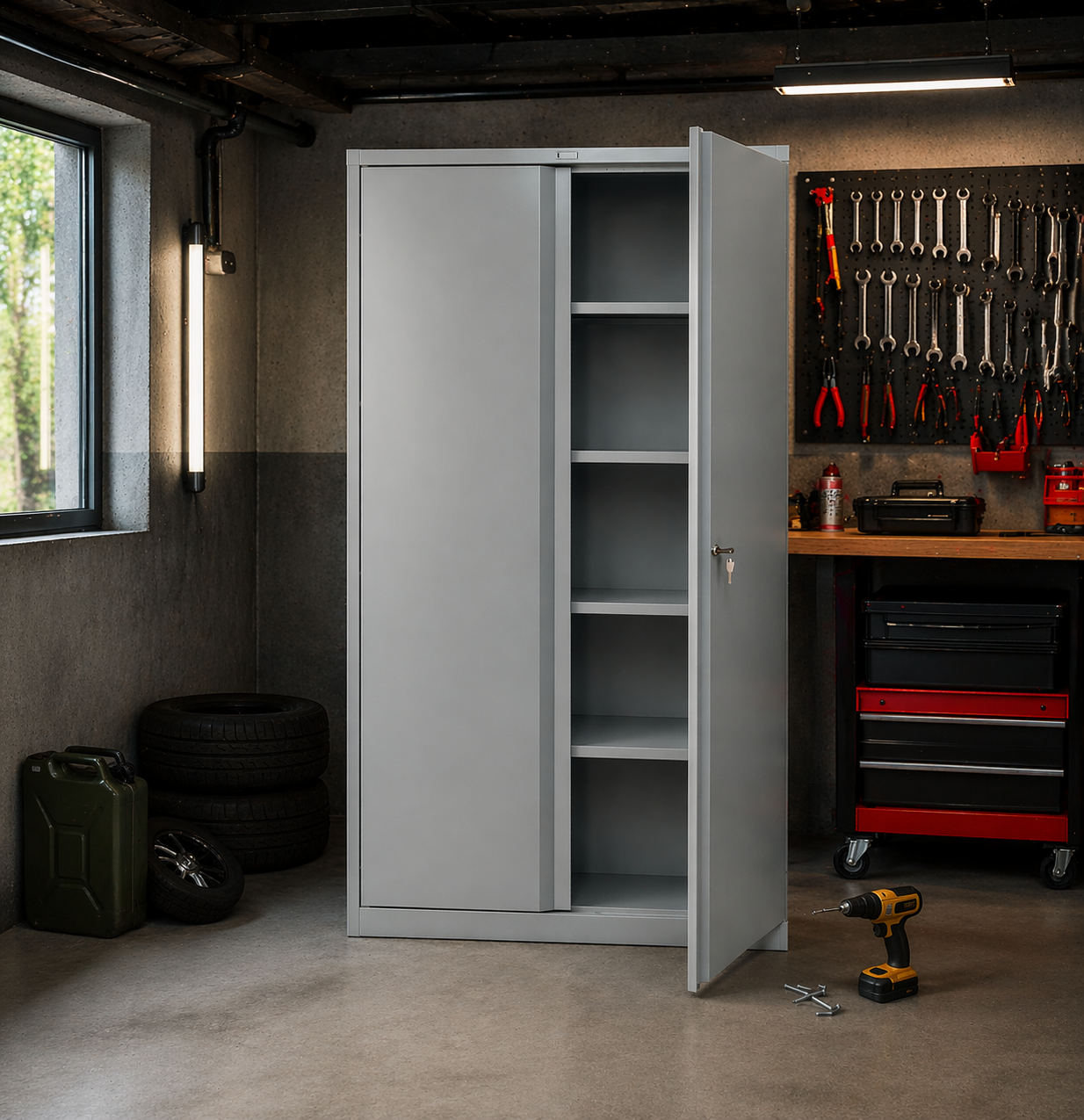 Szafa oferuje dużo miejsca do przechowywania, pomagając utrzymać porządek w garażu lub warsztacie.